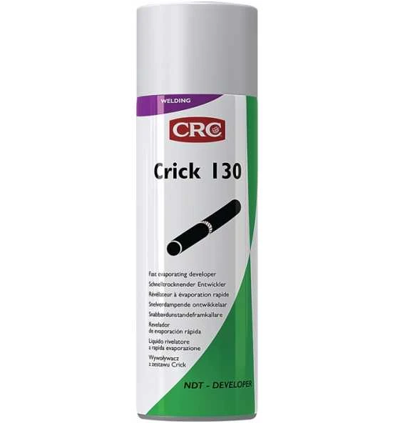 weißer Entwickler zur zerstörungsfreine Rissprüfung an Metall- und Kunststoffoberflächen · Rissprüfsystem für die Sichtprüfung schadhafter Stellen bei Schweißnähten, Tanks, Rohren, Gabelstaplern und Hebebühnen · nach Eindringverfahren gemäß DIN EN ISO 3452 · CRICK Rissprüfsystem: CRICK 110 Reiniger, CRICK 120 Rotes Eindringmittel, CRICK 130 Nassentwickler