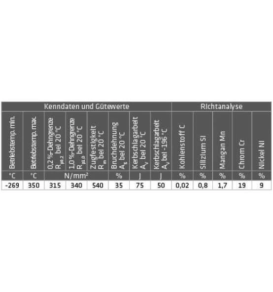 Schweißdraht aus Chrom-Nickel-Stahl 1.4316 mit besonders niedrigem Kohlenstoffgehalt für das Verschweißen von nichtrostendem, kaltzähem, austenitischem Stahl. Gefüge Austenit mit Deltaferrit. Betriebstemperatur bis 350 °C. Kaltzäh bis -269 °C.MAG-Verarbeitung unter Mischgas, z.B. M 11, M12 oder M 23,WIG-Verarbeitung mit Abspulgerät unter Schutzgas Argon.NormbezeichnungEN 12072 – G 19 9 Lsi/W 19 9 LsiWerkstoffnummer1.4316ZulassungenTÜV, DB, UDT, CEStromart MIG/MAGGleichstrom Pluspol (= +)Stromart WIGGleichstrom Minuspol (= -)Werkstoffe: 1.4301, 1.4303, 1.4306, 1.4308, 1.4310, 1.4311, 1.4319, 1.4541, 1.4550, 1.4552