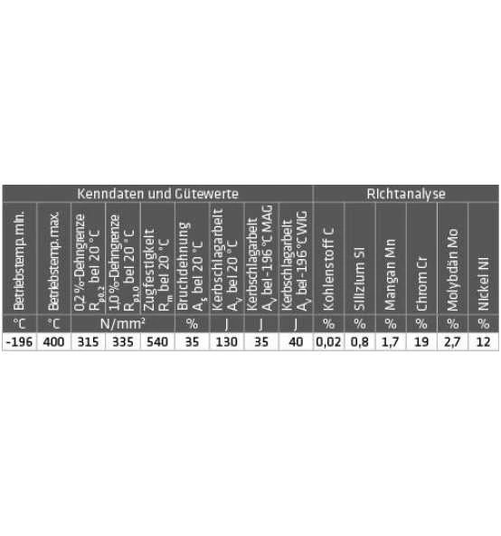 Schweißdraht aus Chrom-Nickel-Molybdän-Stahl 1.4430 mit besonders niedrigem Kohlenstoffgehalt für das Verschweißen von nichtrostendem, kaltzähem, austenitischem Stahl. Gefüge Austenit mit Deltaferrit. Betriebstemperatur bis 400 °C. Kaltzäh bis -196 °C.MAG-Verarbeitung unter Mischgas, z.B. M 11, M 12, M 23, unter Berücksichtigung der Aufkohlung auch M 32, M 21, M13.WIG-Verarbeitung mit Abspulgerät unter Schutzgas Argon.NormbezeichnungEN 12072 – G 19 12 3 Lsi/W 19 12 3 LsiWerkstoffnummer1.4430ZulassungenTÜV, DB, UDT, CEStromart MIG/MAGGleichstrom Pluspol (= +)Stromart WIGGleichstrom Minuspol (= -)Werkstoffe: 1.4401, 1.4404, 1.4406, 1.4408, 1.4410, 1.4420, 1.4429, 1.4435, 1.4436, 1.4437, 1.4571, 1.4573, 1.4580, 1.4581, 1.4583