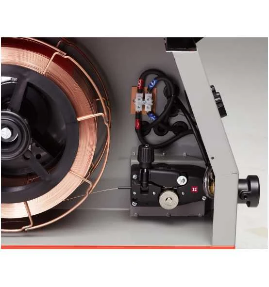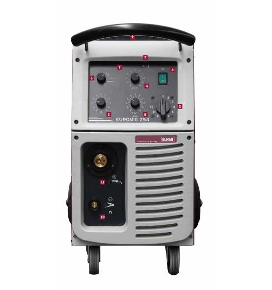 - EUROMIGplus – Übersicht:1. Ergonomisches Bedienfeld, schräge Anordnung für gute Übersicht2. Schweißstrom-Leistungsschalter3. Drahtvorschubregler stufenlos4. Punktschweißautomatik stufenlos für einfache Reproduzierbarkeit von Schweißpunkten5. Temperaturkontrolllampe – alle EM mit effizientem Überlastschutz inkl. Rückstellautomatik, Thermofühler in Transformatorwicklung integriert6. Hauptschalter mit Betriebslampe7. Werkzeugablage mit Anti-Rutschbelag8. Masseanschluss-Buchse Ø 9 mm, 16/25 mm²9. Schlauchpaketanschluss EURO-Norm für BINZEL10. Drahtvorschubmotor mit zwei Vorschubrollen, Führungsrolle einstellbar11. Schlauchpaketanschluss EURO-Norm für BINZEL12. EM 174: Drahtvorschubmotor mit zwei Vorschubrollen, Führungsrolle einstellbar