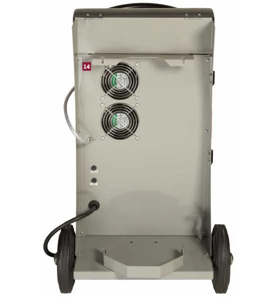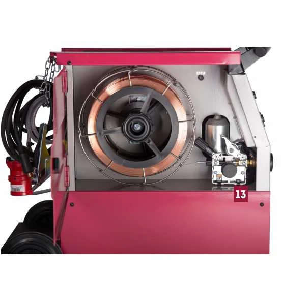 - EUROMIGplus – Übersicht:1. Ergonomisches Bedienfeld, schräge Anordnung für gute Übersicht2. Schweißstrom-Leistungsschalter3. Drahtvorschubregler stufenlos4. Punktschweißautomatik stufenlos für einfache Reproduzierbarkeit von Schweißpunkten5. Temperaturkontrolllampe – alle EM mit effizientem Überlastschutz inkl. Rückstellautomatik, Thermofühler in Transformatorwicklung integriert6. Hauptschalter mit Betriebslampe7. Werkzeugablage mit Anti-Rutschbelag8. Masseanschluss-Buchse Ø 9 mm, 16/25 mm²9. Schlauchpaketanschluss EURO-Norm für BINZEL10. Drahtvorschubmotor mit zwei Vorschubrollen, Führungsrolle einstellbar11. Schlauchpaketanschluss EURO-Norm für BINZEL13. Drahtvorschub mit Zahnradantrieb, Führungsrolle geöffnet/geschlossen14. Leistungsstarker Kühlventilator